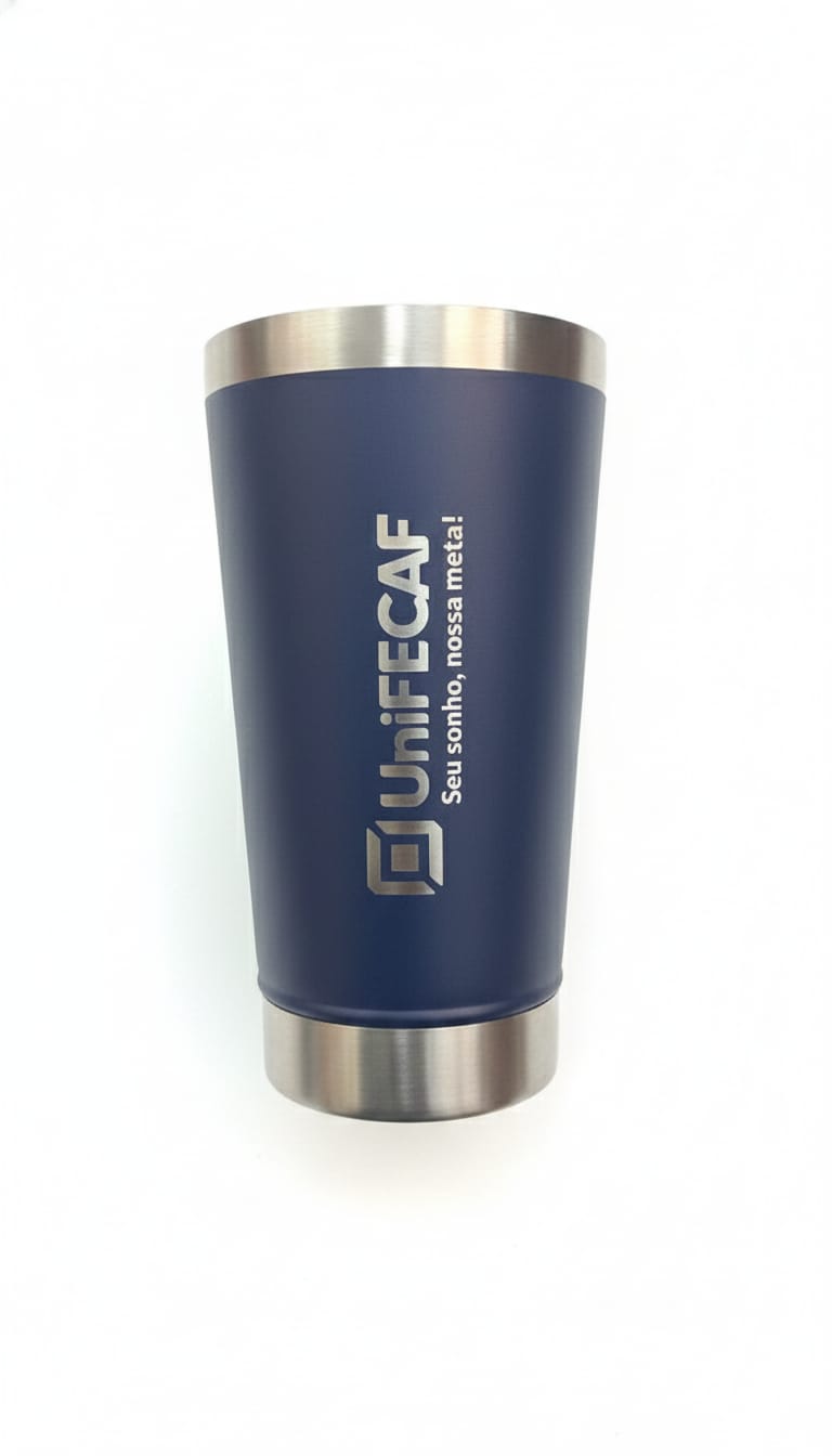 Copo térmico de cor azul-marinho (ou azul escuro) com detalhes em metal (prata/aço inoxidável) na borda superior e na base.
